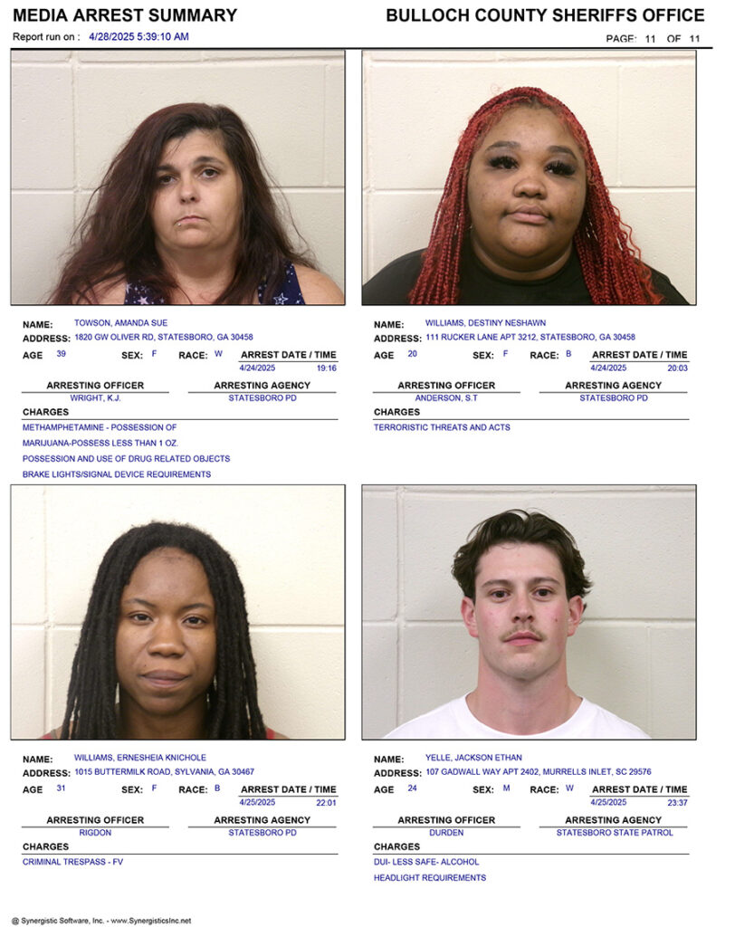 These records are matters of public information provided by the Bulloch County Sheriff’s Office. Booking reports are details of arrests only. All persons below are considered to be innocent unless proven otherwise in a court of law.