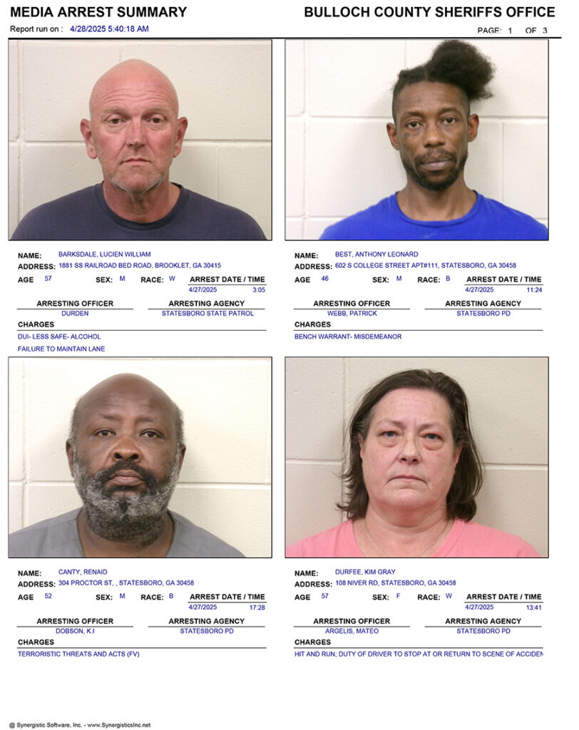 These records are matters of public information provided by the Bulloch County Sheriff’s Office. Booking reports are details of arrests only. All persons below are considered to be innocent unless proven otherwise in a court of law.
