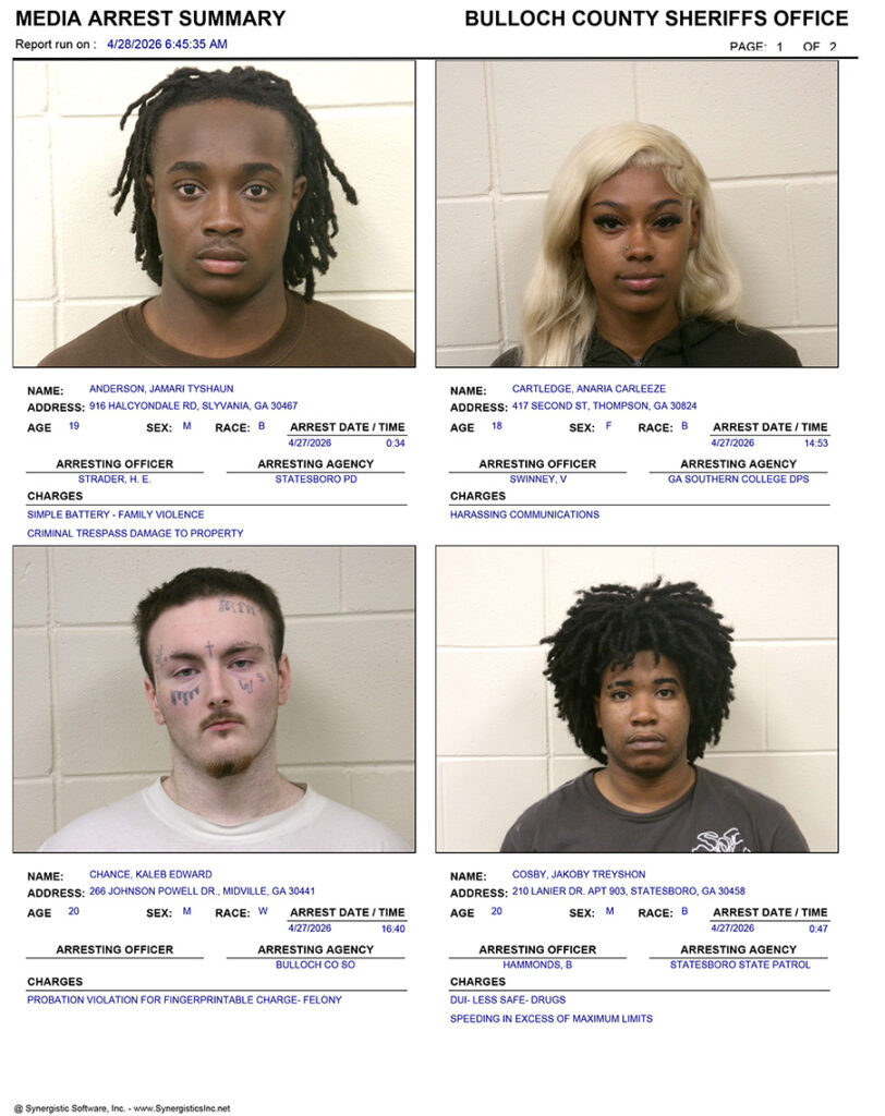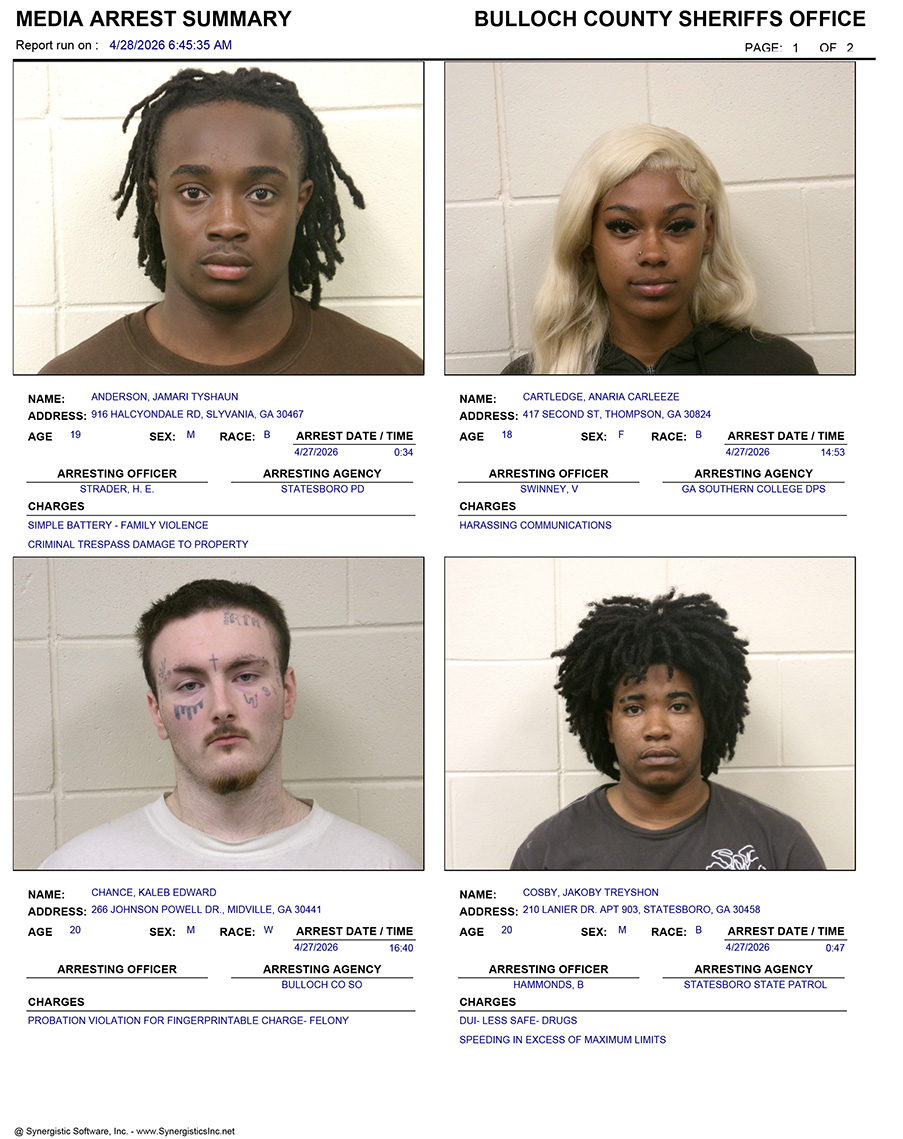 These records are matters of public information provided by the Bulloch County Sheriff’s Office. Booking reports are details of arrests only. All persons below are considered to be innocent unless proven otherwise in a court of law.