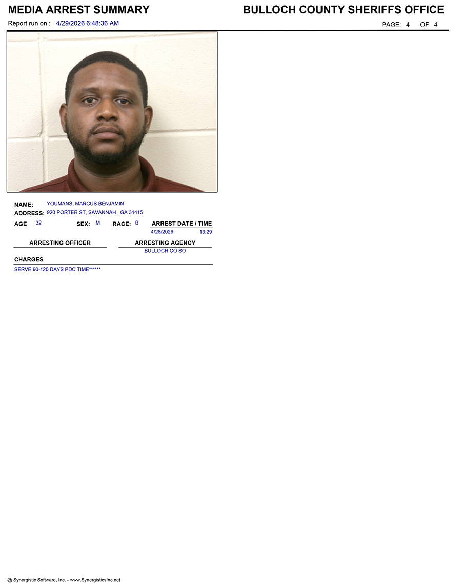 These records are matters of public information provided by the Bulloch County Sheriff’s Office. Booking reports are details of arrests only. All persons below are considered to be innocent unless proven otherwise in a court of law.
