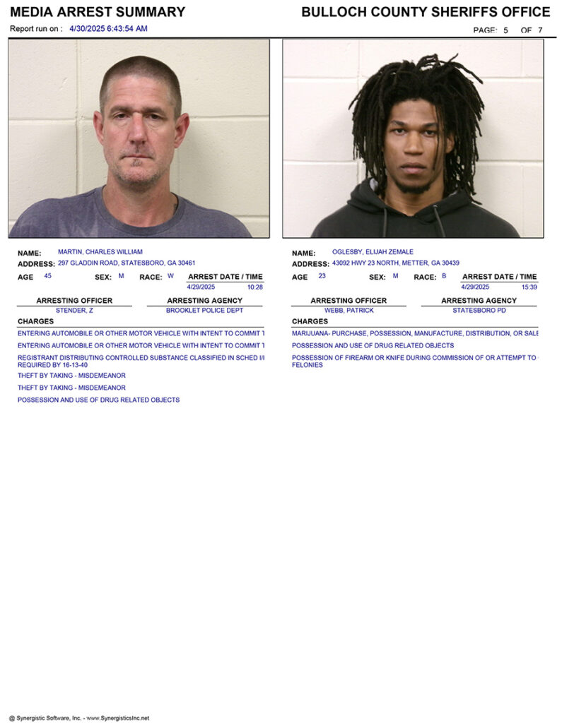 These records are matters of public information provided by the Bulloch County Sheriff’s Office. Booking reports are details of arrests only. All persons below are considered to be innocent unless proven otherwise in a court of law.