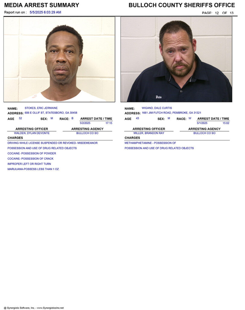These records are matters of public information provided by the Bulloch County Sheriff’s Office. Booking reports are details of arrests only. All persons below are considered to be innocent unless proven otherwise in a court of law.