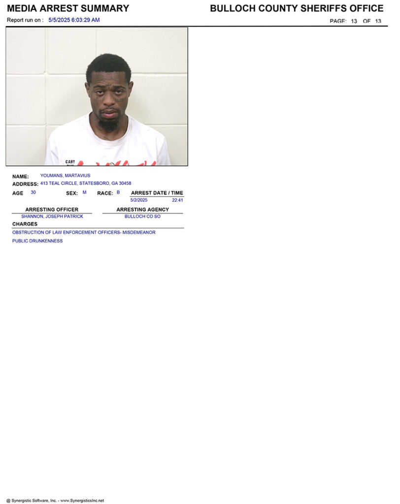 These records are matters of public information provided by the Bulloch County Sheriff’s Office. Booking reports are details of arrests only. All persons below are considered to be innocent unless proven otherwise in a court of law.