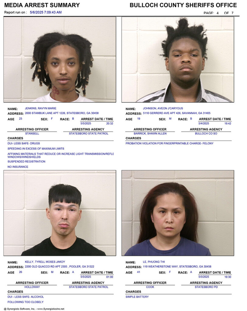 These records are matters of public information provided by the Bulloch County Sheriff’s Office. Booking reports are details of arrests only. All persons below are considered to be innocent unless proven otherwise in a court of law.