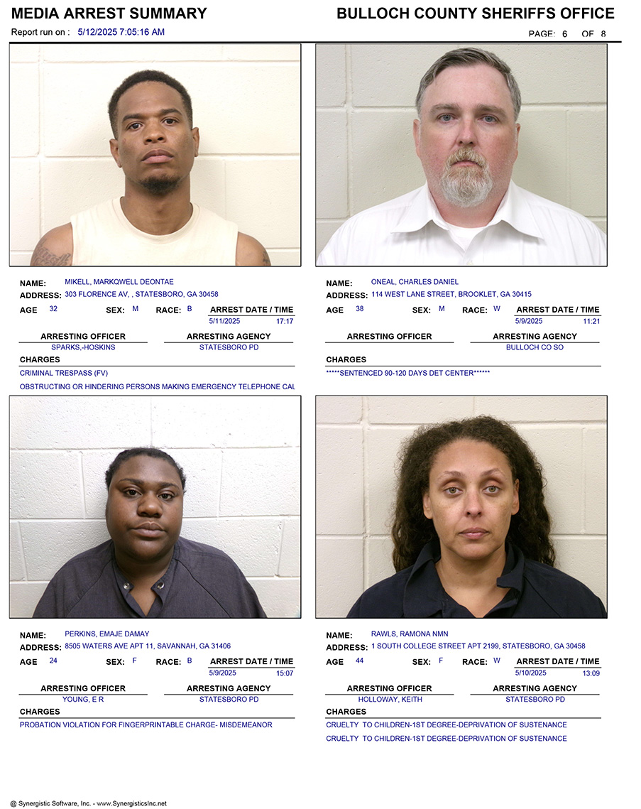 These records are matters of public information provided by the Bulloch County Sheriff’s Office. Booking reports are details of arrests only. All persons below are considered to be innocent unless proven otherwise in a court of law.