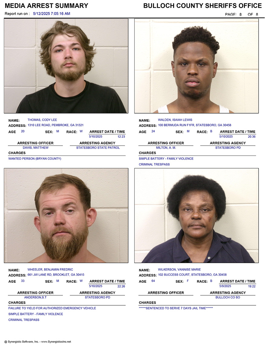 These records are matters of public information provided by the Bulloch County Sheriff’s Office. Booking reports are details of arrests only. All persons below are considered to be innocent unless proven otherwise in a court of law.