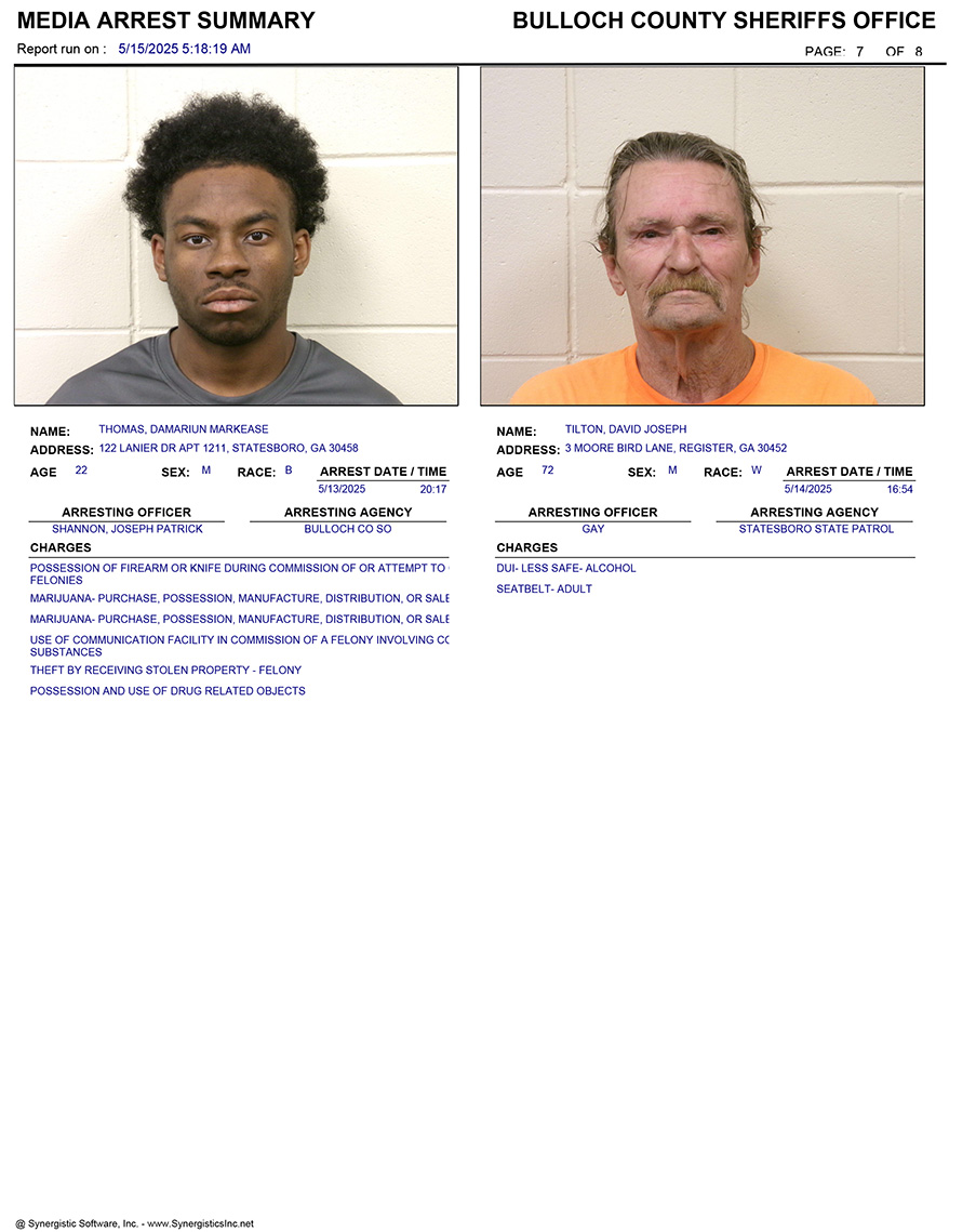 These records are matters of public information provided by the Bulloch County Sheriff’s Office. Booking reports are details of arrests only. All persons below are considered to be innocent unless proven otherwise in a court of law.