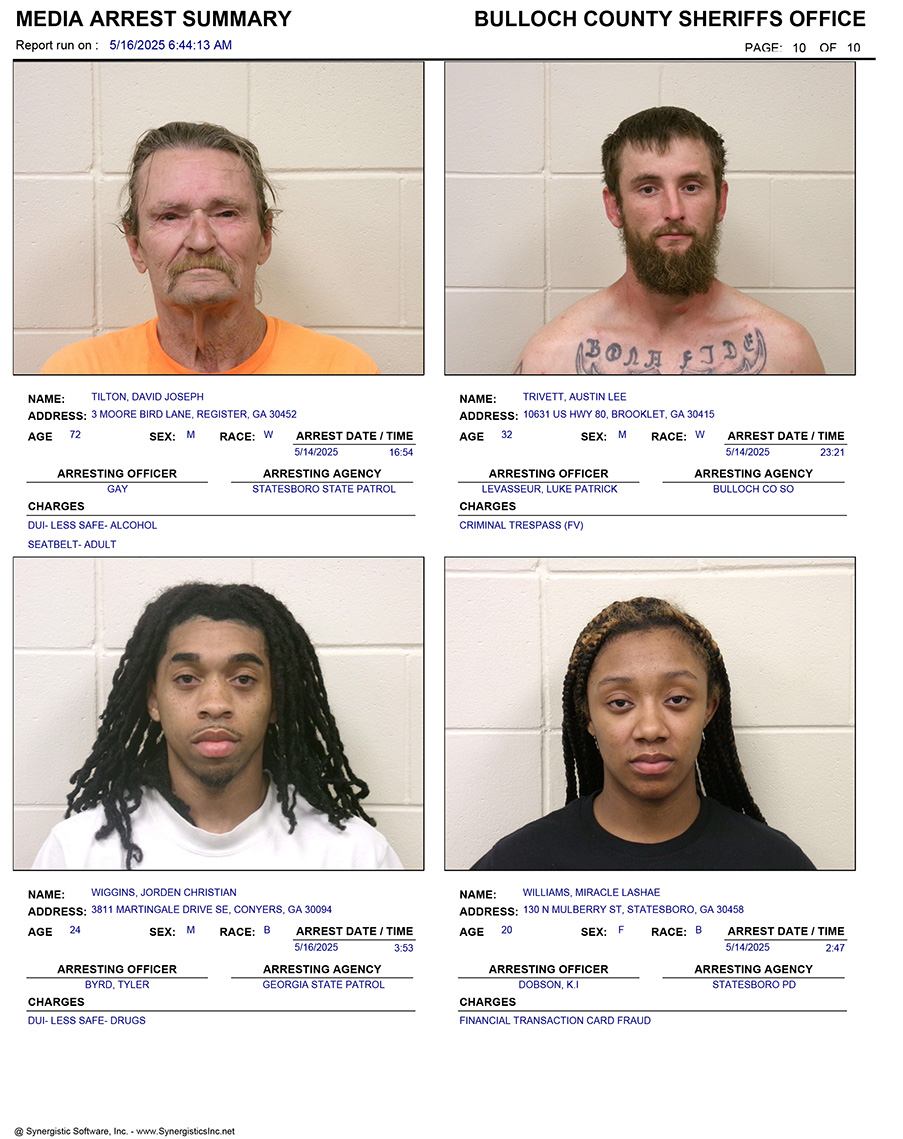 These records are matters of public information provided by the Bulloch County Sheriff’s Office. Booking reports are details of arrests only. All persons below are considered to be innocent unless proven otherwise in a court of law.