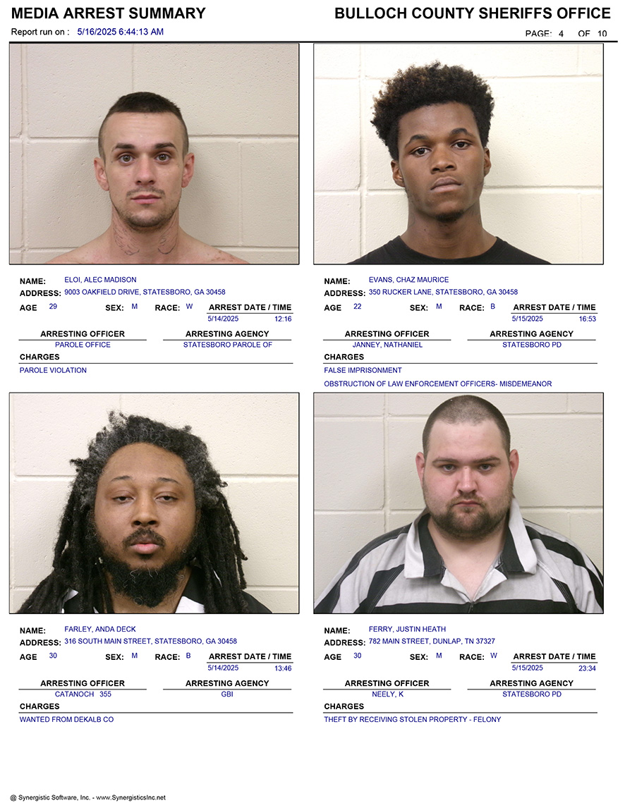 These records are matters of public information provided by the Bulloch County Sheriff’s Office. Booking reports are details of arrests only. All persons below are considered to be innocent unless proven otherwise in a court of law.