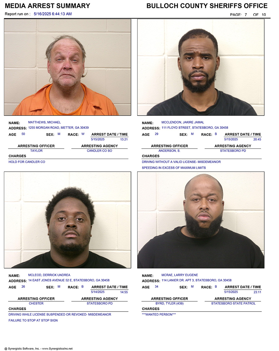 These records are matters of public information provided by the Bulloch County Sheriff’s Office. Booking reports are details of arrests only. All persons below are considered to be innocent unless proven otherwise in a court of law.