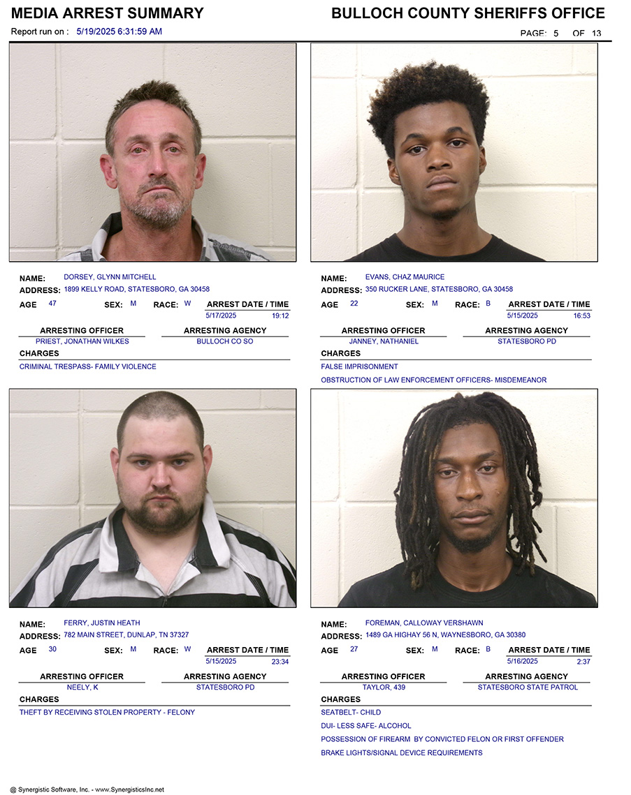These records are matters of public information provided by the Bulloch County Sheriff’s Office. Booking reports are details of arrests only. All persons below are considered to be innocent unless proven otherwise in a court of law.