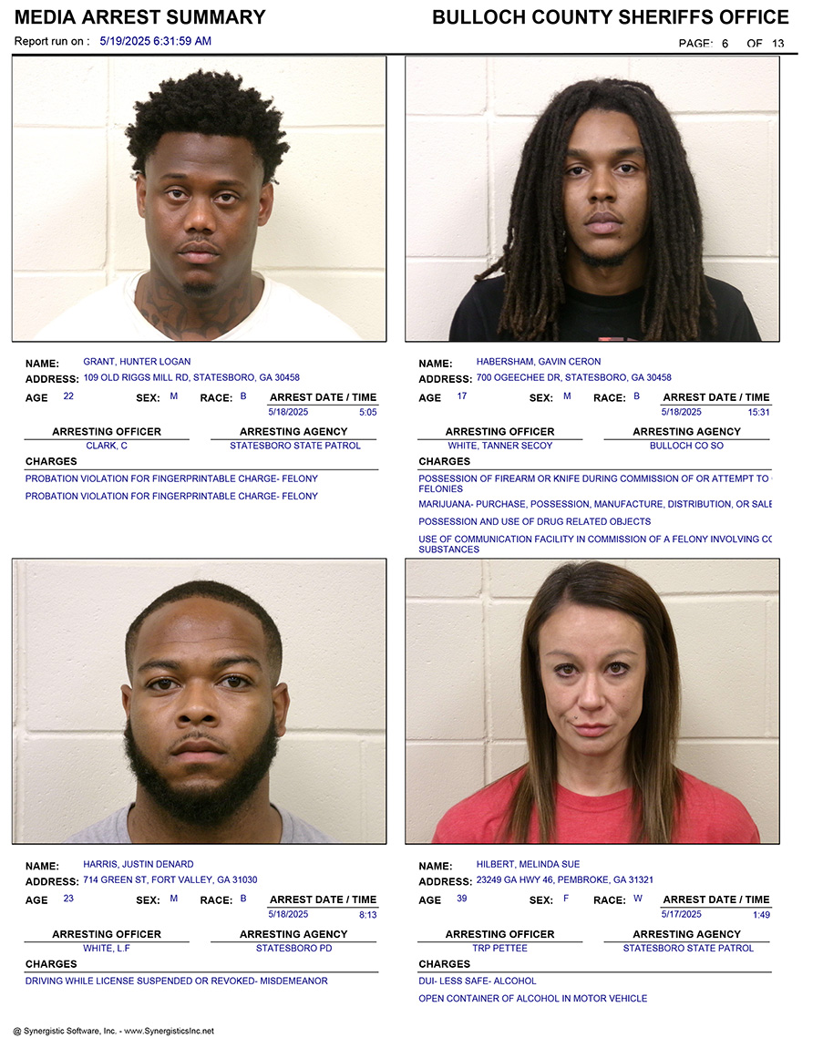 These records are matters of public information provided by the Bulloch County Sheriff’s Office. Booking reports are details of arrests only. All persons below are considered to be innocent unless proven otherwise in a court of law.