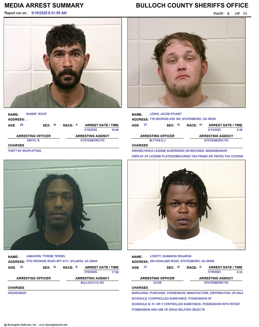 These records are matters of public information provided by the Bulloch County Sheriff’s Office. Booking reports are details of arrests only. All persons below are considered to be innocent unless proven otherwise in a court of law.