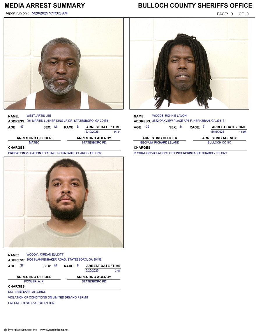 These records are matters of public information provided by the Bulloch County Sheriff’s Office. Booking reports are details of arrests only. All persons below are considered to be innocent unless proven otherwise in a court of law.