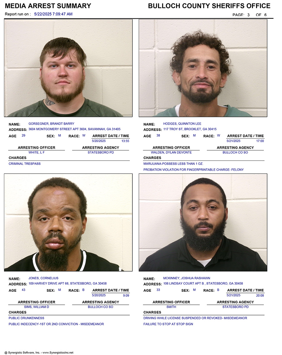 These records are matters of public information provided by the Bulloch County Sheriff’s Office. Booking reports are details of arrests only. All persons below are considered to be innocent unless proven otherwise in a court of law.
