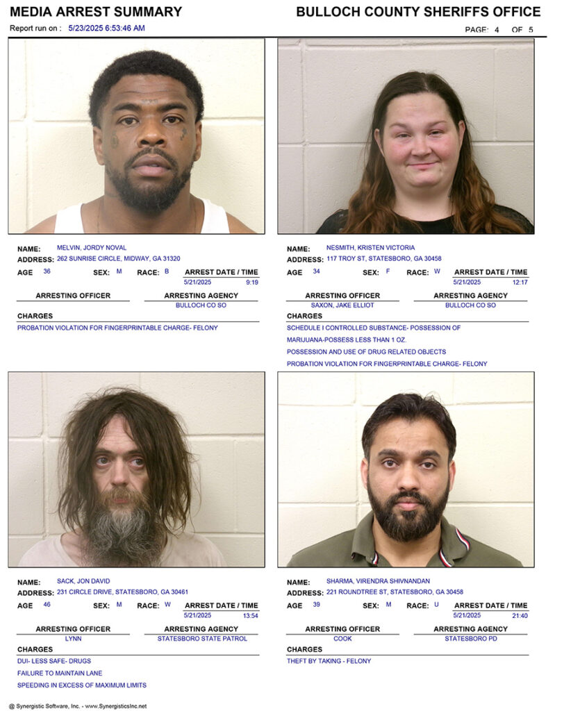 These records are matters of public information provided by the Bulloch County Sheriff’s Office. Booking reports are details of arrests only. All persons below are considered to be innocent unless proven otherwise in a court of law.