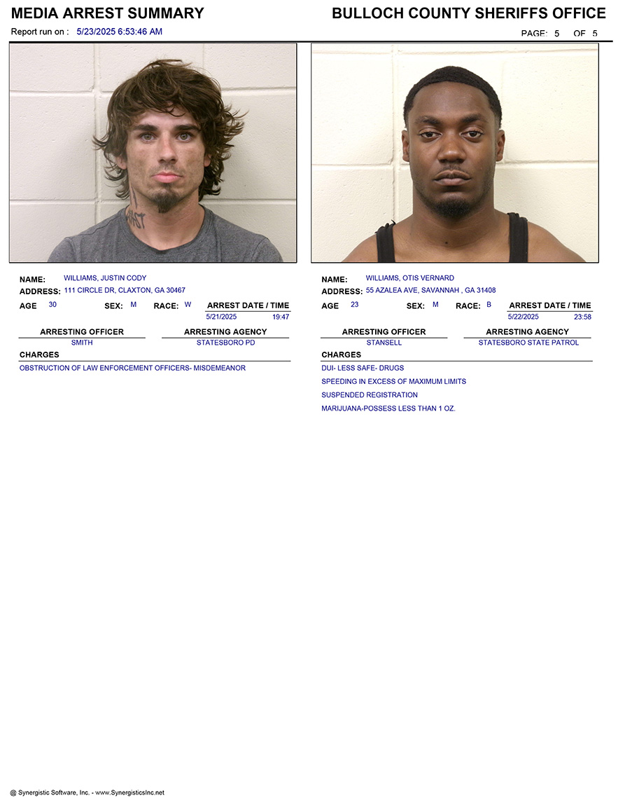These records are matters of public information provided by the Bulloch County Sheriff’s Office. Booking reports are details of arrests only. All persons below are considered to be innocent unless proven otherwise in a court of law.