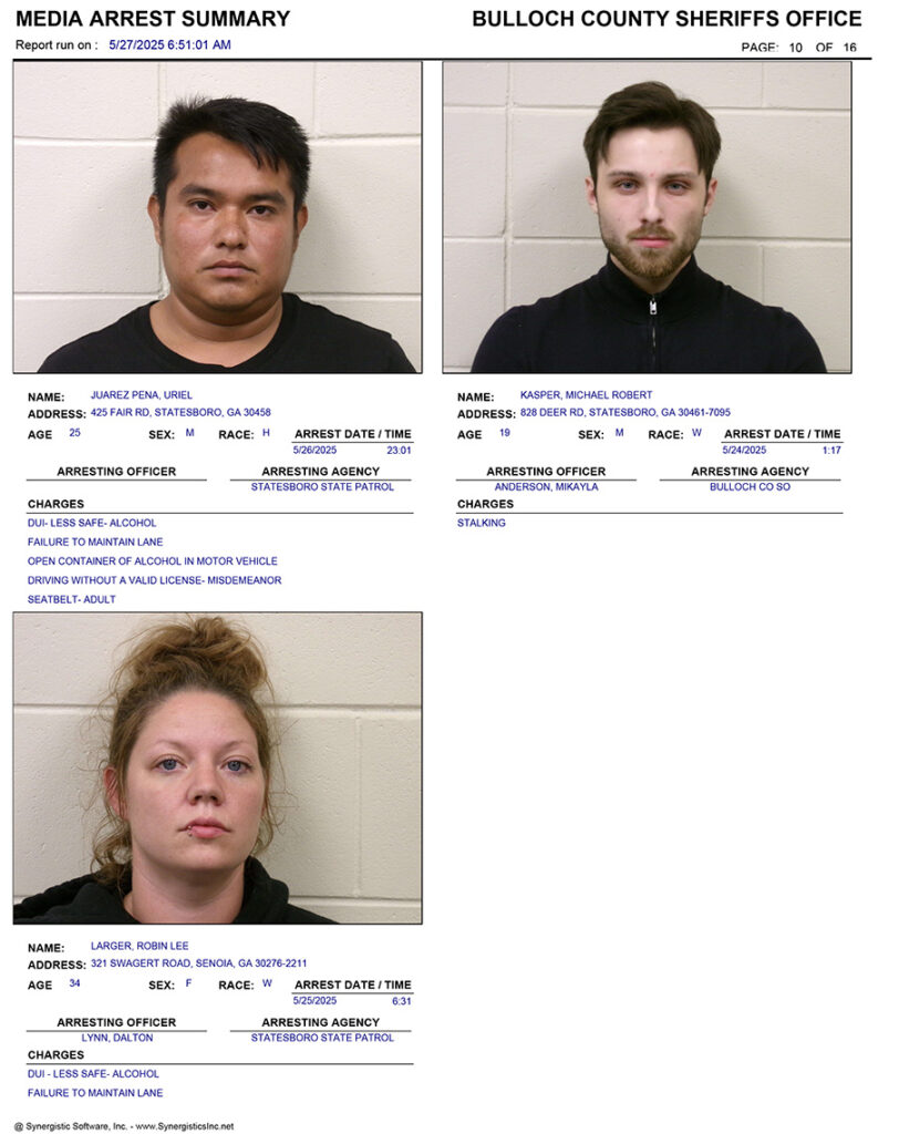 These records are matters of public information provided by the Bulloch County Sheriff’s Office. Booking reports are details of arrests only. All persons below are considered to be innocent unless proven otherwise in a court of law.