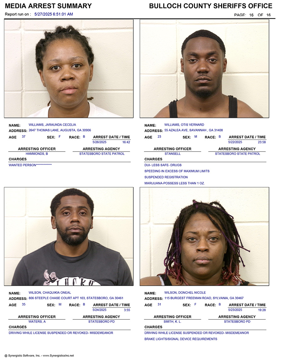These records are matters of public information provided by the Bulloch County Sheriff’s Office. Booking reports are details of arrests only. All persons below are considered to be innocent unless proven otherwise in a court of law.
