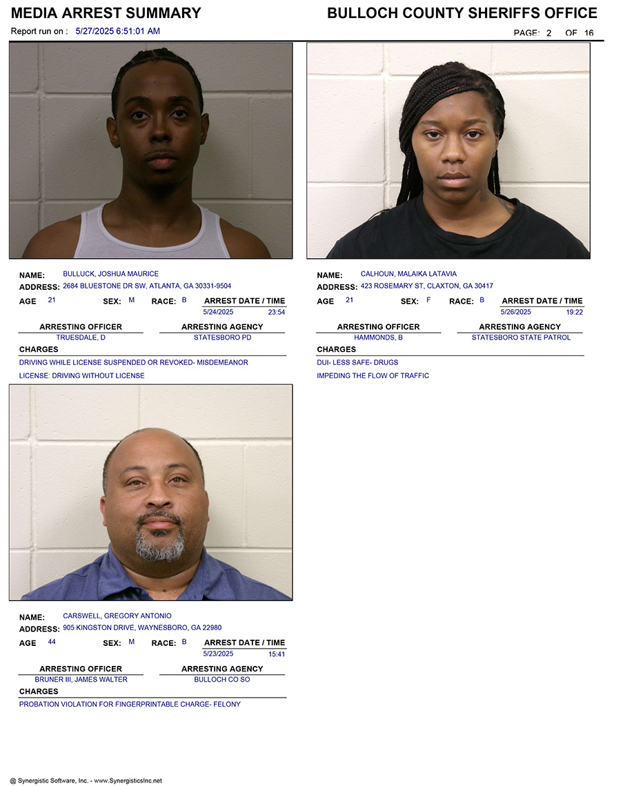 These records are matters of public information provided by the Bulloch County Sheriff’s Office. Booking reports are details of arrests only. All persons below are considered to be innocent unless proven otherwise in a court of law.