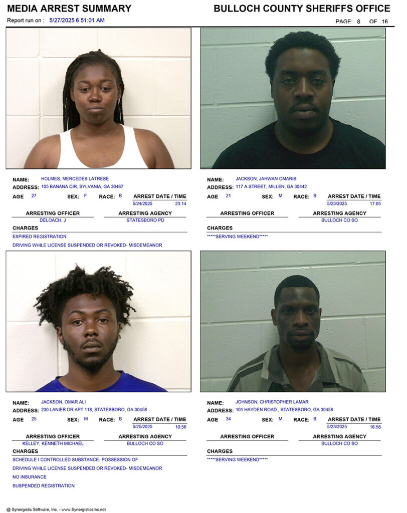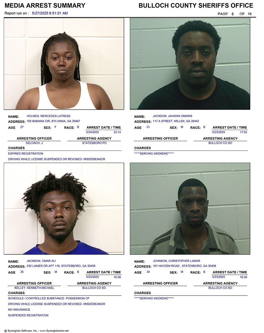 These records are matters of public information provided by the Bulloch County Sheriff’s Office. Booking reports are details of arrests only. All persons below are considered to be innocent unless proven otherwise in a court of law.