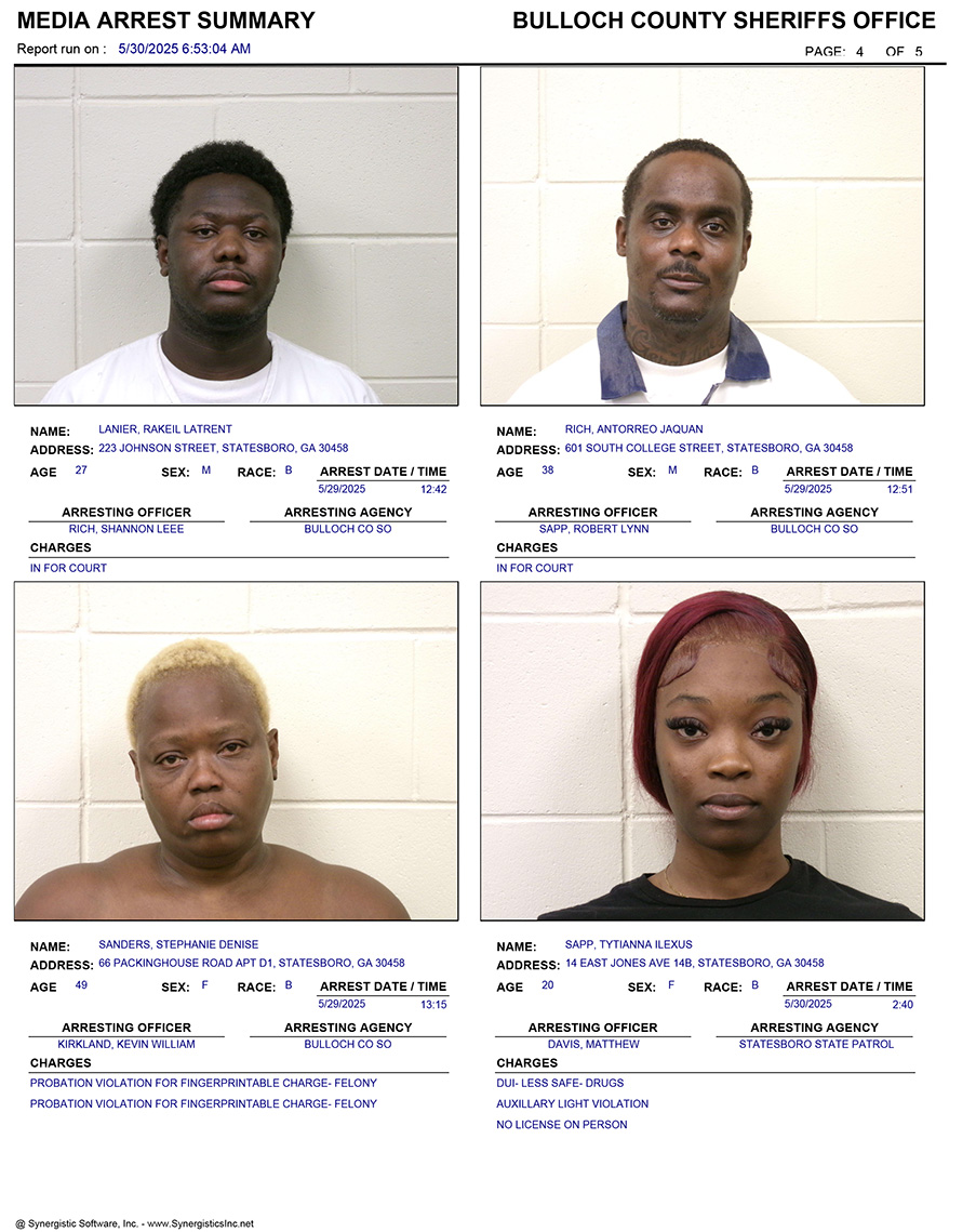 These records are matters of public information provided by the Bulloch County Sheriff’s Office. Booking reports are details of arrests only. All persons below are considered to be innocent unless proven otherwise in a court of law.
