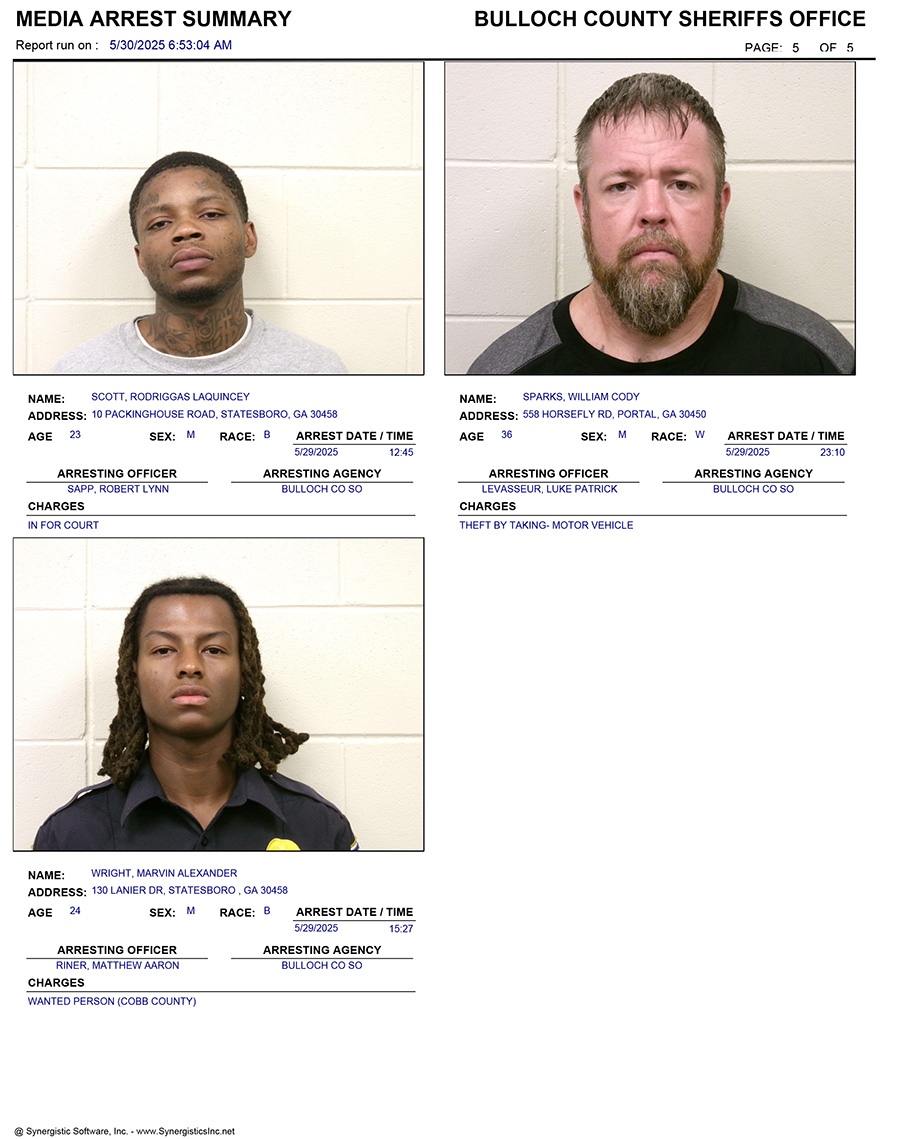 These records are matters of public information provided by the Bulloch County Sheriff’s Office. Booking reports are details of arrests only. All persons below are considered to be innocent unless proven otherwise in a court of law.