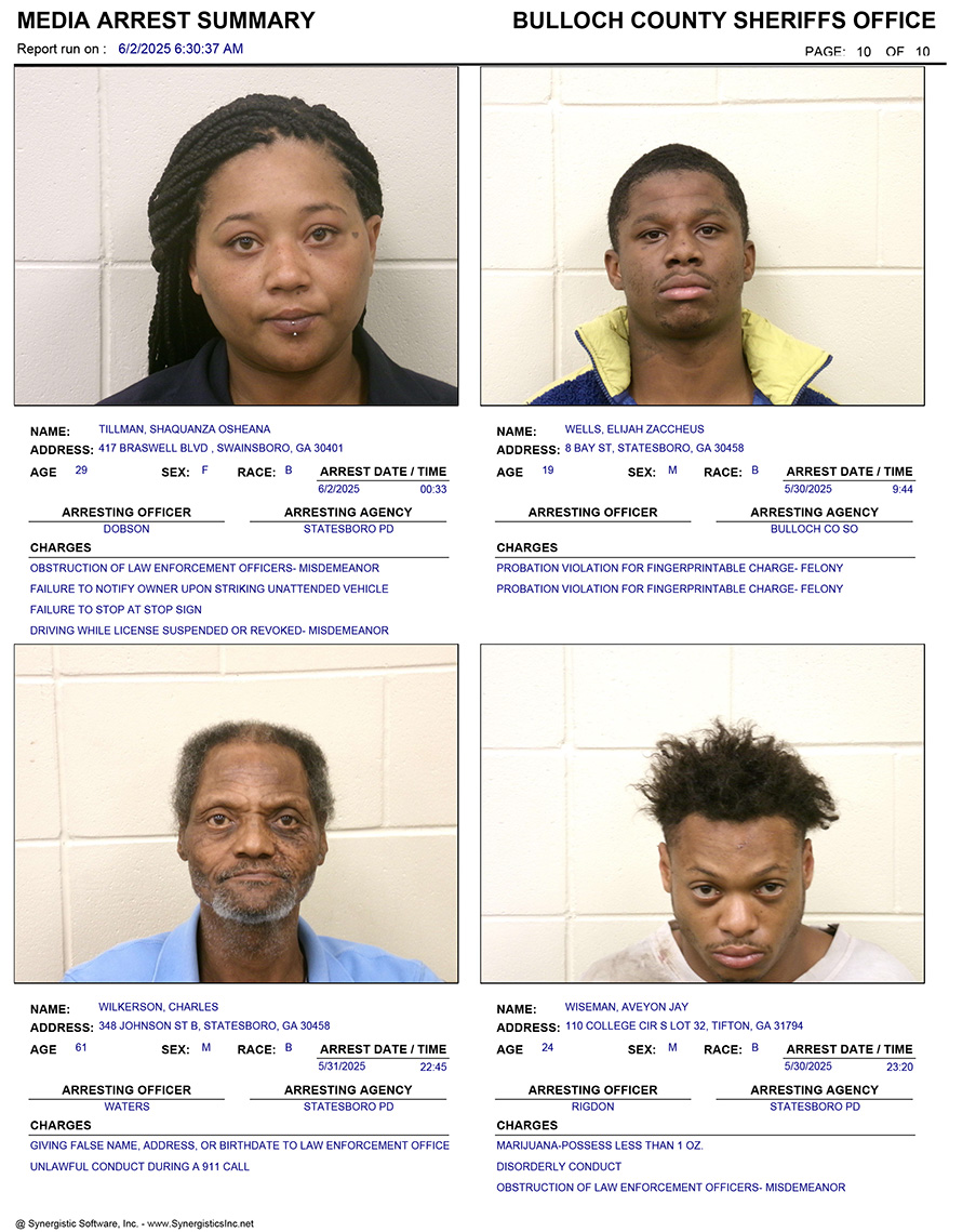 These records are matters of public information provided by the Bulloch County Sheriff’s Office. Booking reports are details of arrests only. All persons below are considered to be innocent unless proven otherwise in a court of law.