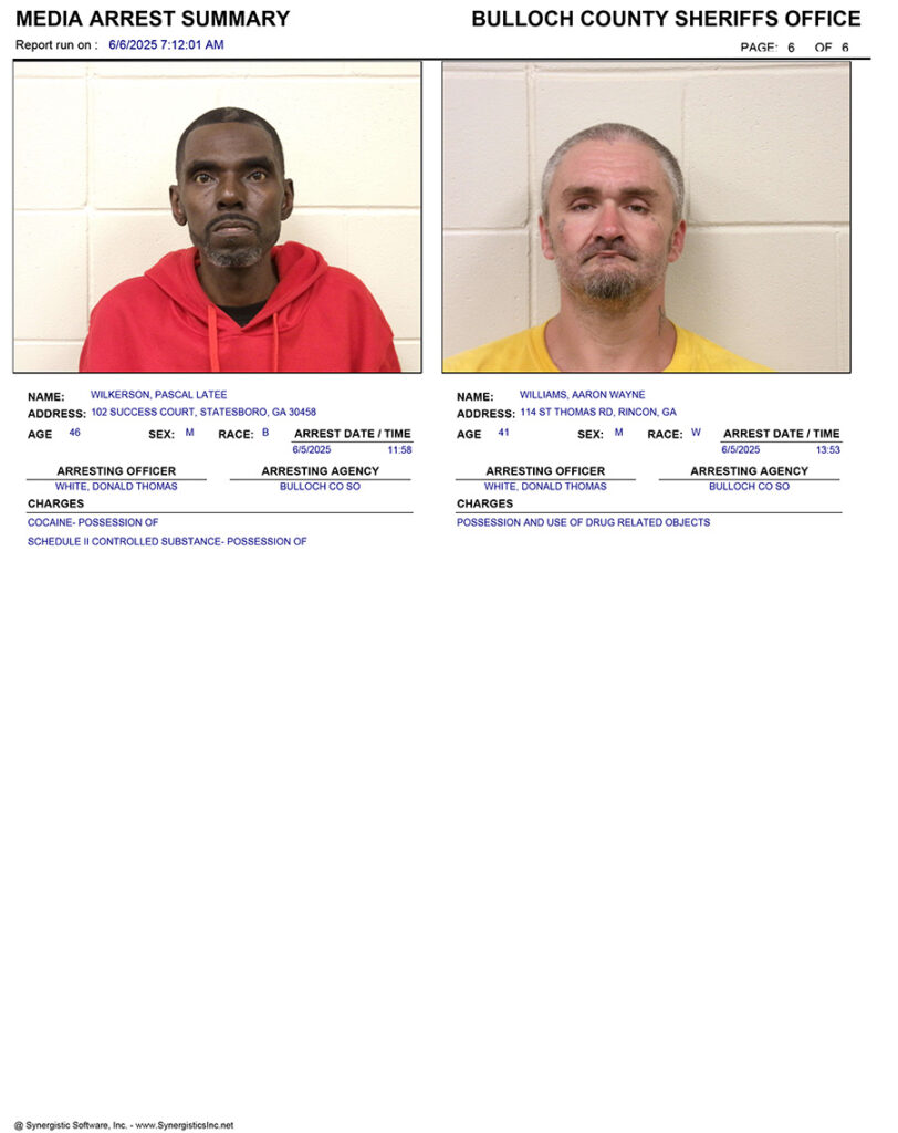 These records are matters of public information provided by the Bulloch County Sheriff’s Office. Booking reports are details of arrests only. All persons below are considered to be innocent unless proven otherwise in a court of law.