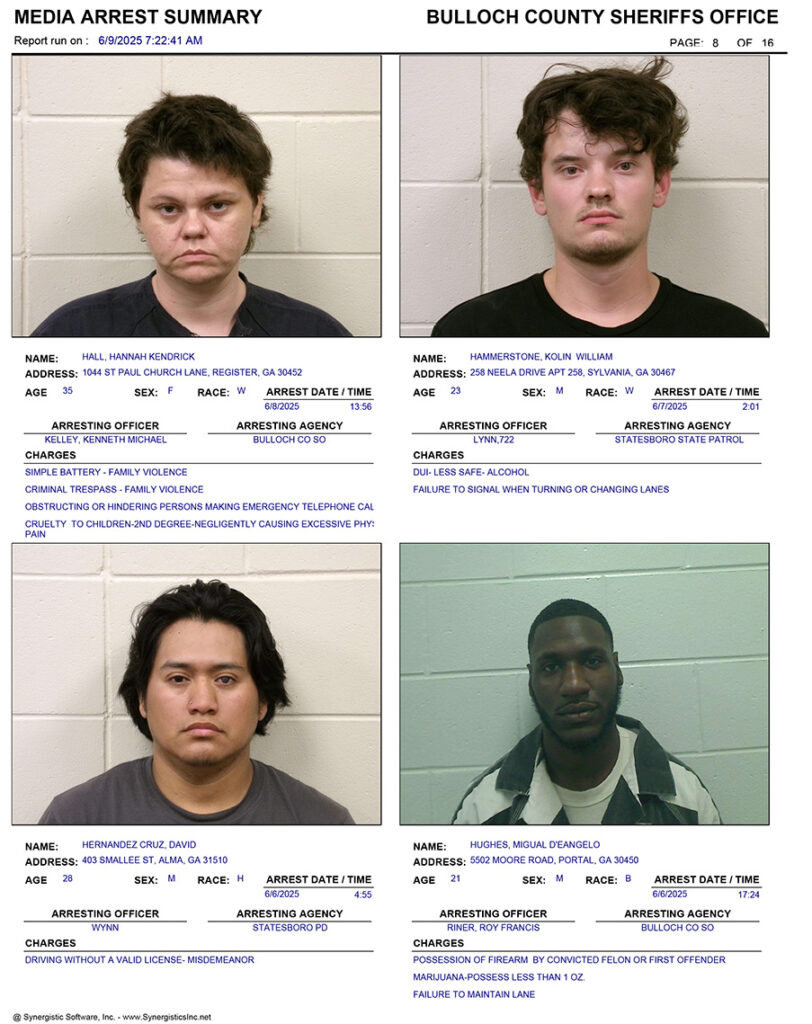 These records are matters of public information provided by the Bulloch County Sheriff’s Office. Booking reports are details of arrests only. All persons below are considered to be innocent unless proven otherwise in a court of law.