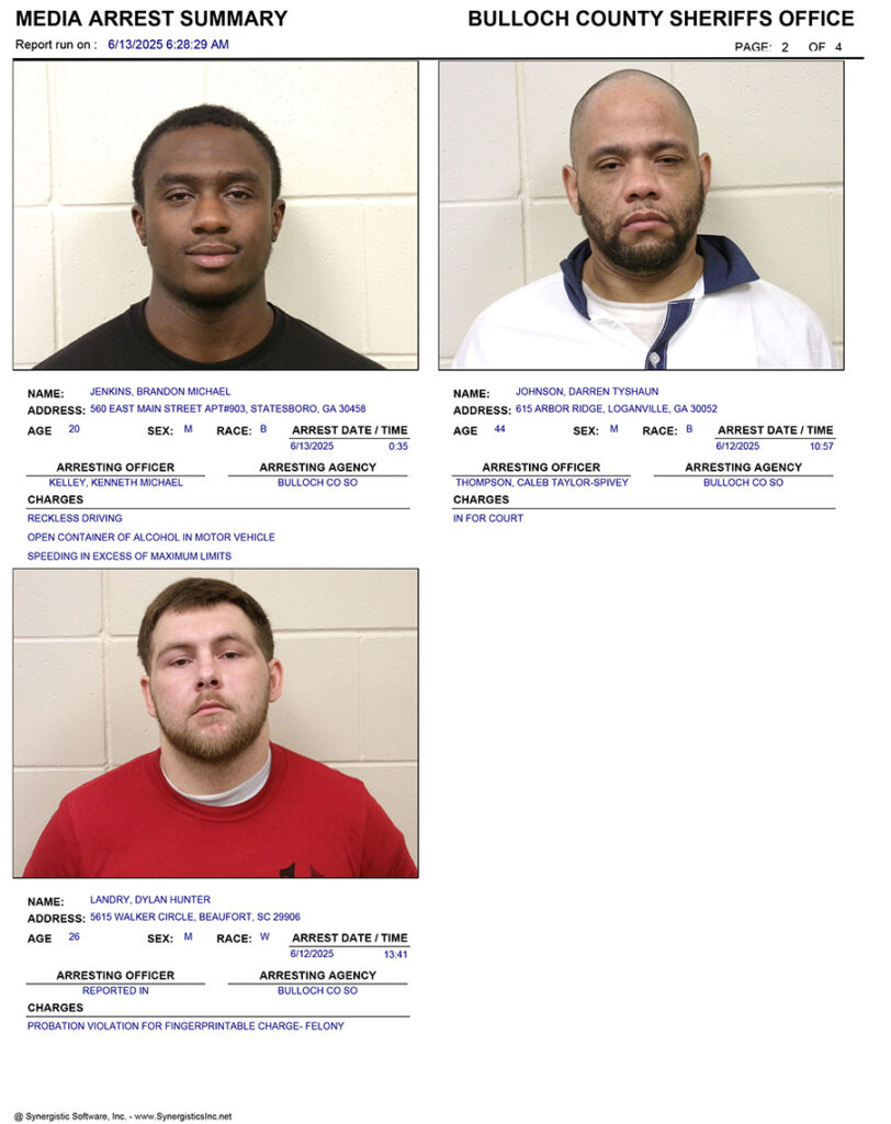 These records are matters of public information provided by the Bulloch County Sheriff’s Office. Booking reports are details of arrests only. All persons below are considered to be innocent unless proven otherwise in a court of law.