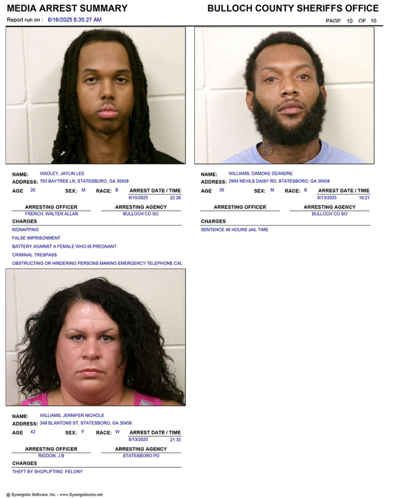 These records are matters of public information provided by the Bulloch County Sheriff’s Office. Booking reports are details of arrests only. All persons below are considered to be innocent unless proven otherwise in a court of law.