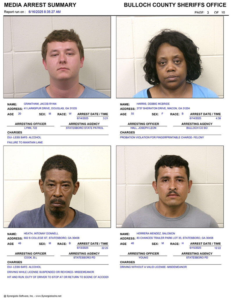 These records are matters of public information provided by the Bulloch County Sheriff’s Office. Booking reports are details of arrests only. All persons below are considered to be innocent unless proven otherwise in a court of law.