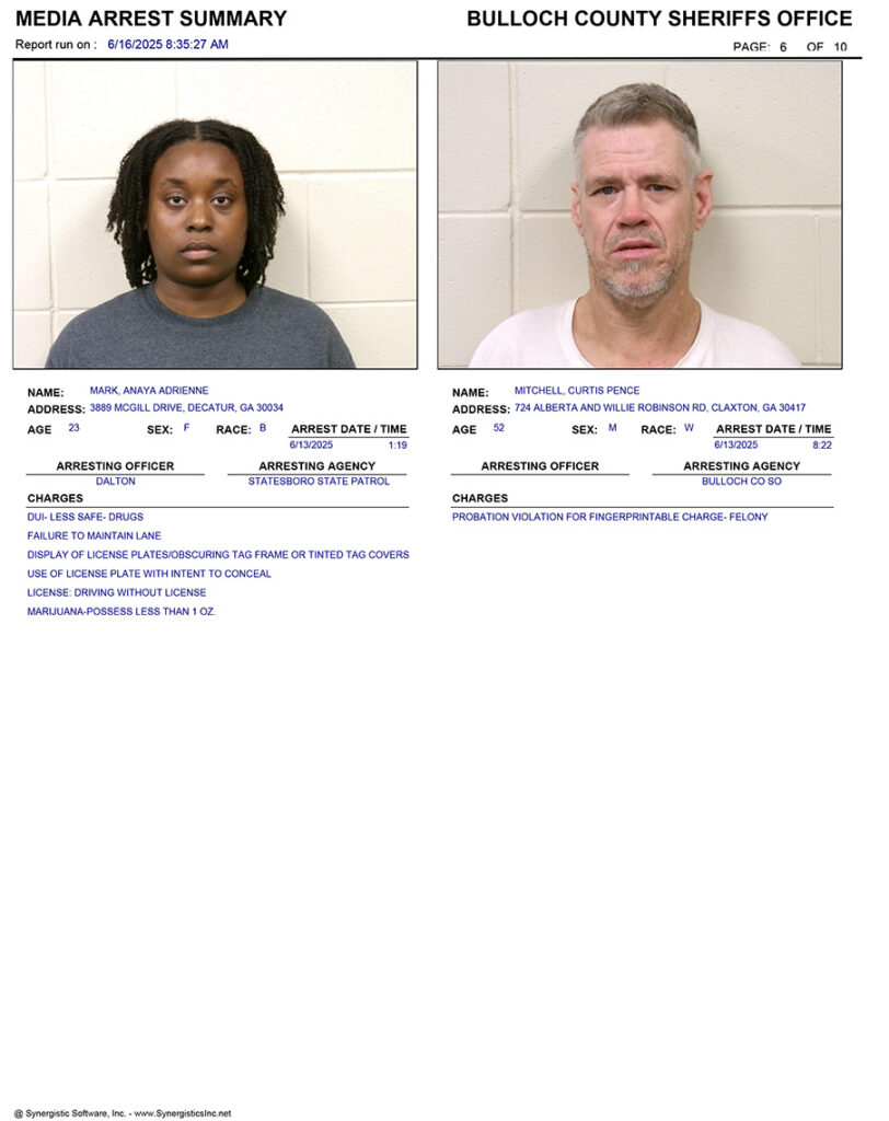 These records are matters of public information provided by the Bulloch County Sheriff’s Office. Booking reports are details of arrests only. All persons below are considered to be innocent unless proven otherwise in a court of law.