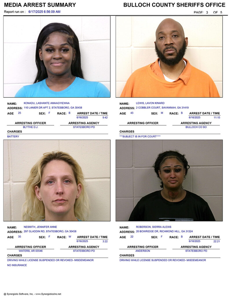 These records are matters of public information provided by the Bulloch County Sheriff’s Office. Booking reports are details of arrests only. All persons below are considered to be innocent unless proven otherwise in a court of law.