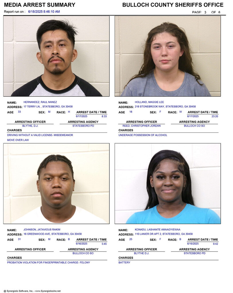 These records are matters of public information provided by the Bulloch County Sheriff’s Office. Booking reports are details of arrests only. All persons below are considered to be innocent unless proven otherwise in a court of law.