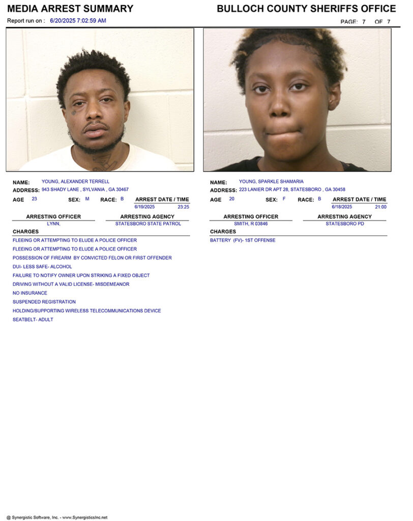 These records are matters of public information provided by the Bulloch County Sheriff’s Office. Booking reports are details of arrests only. All persons below are considered to be innocent unless proven otherwise in a court of law.