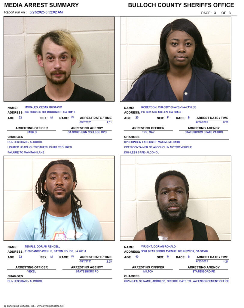 These records are matters of public information provided by the Bulloch County Sheriff’s Office. Booking reports are details of arrests only. All persons below are considered to be innocent unless proven otherwise in a court of law.
