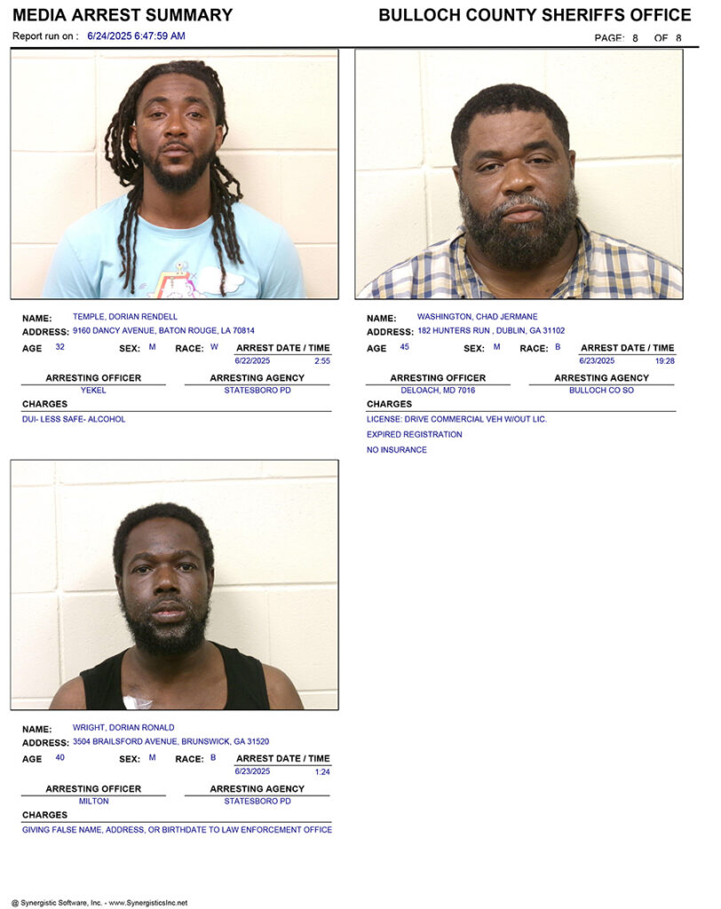 These records are matters of public information provided by the Bulloch County Sheriff’s Office. Booking reports are details of arrests only. All persons below are considered to be innocent unless proven otherwise in a court of law.