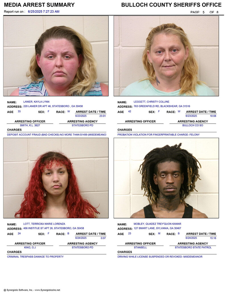 These records are matters of public information provided by the Bulloch County Sheriff’s Office. Booking reports are details of arrests only. All persons below are considered to be innocent unless proven otherwise in a court of law.