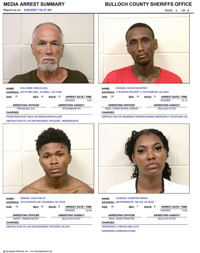 These records are matters of public information provided by the Bulloch County Sheriff’s Office. Booking reports are details of arrests only. All persons below are considered to be innocent unless proven otherwise in a court of law.