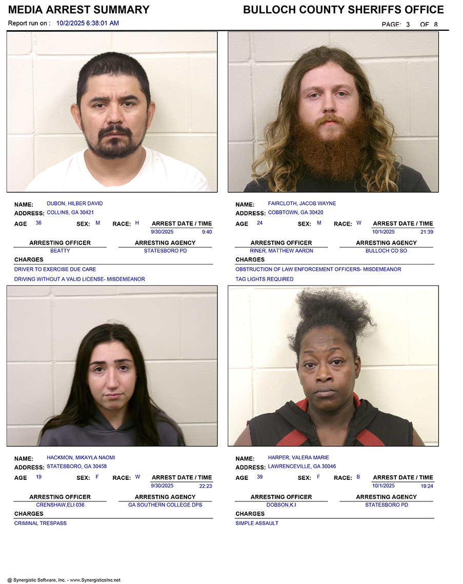 These records are matters of public information provided by the Bulloch County Sheriff’s Office. Booking reports are details of arrests only. All persons below are considered to be innocent unless proven otherwise in a court of law.