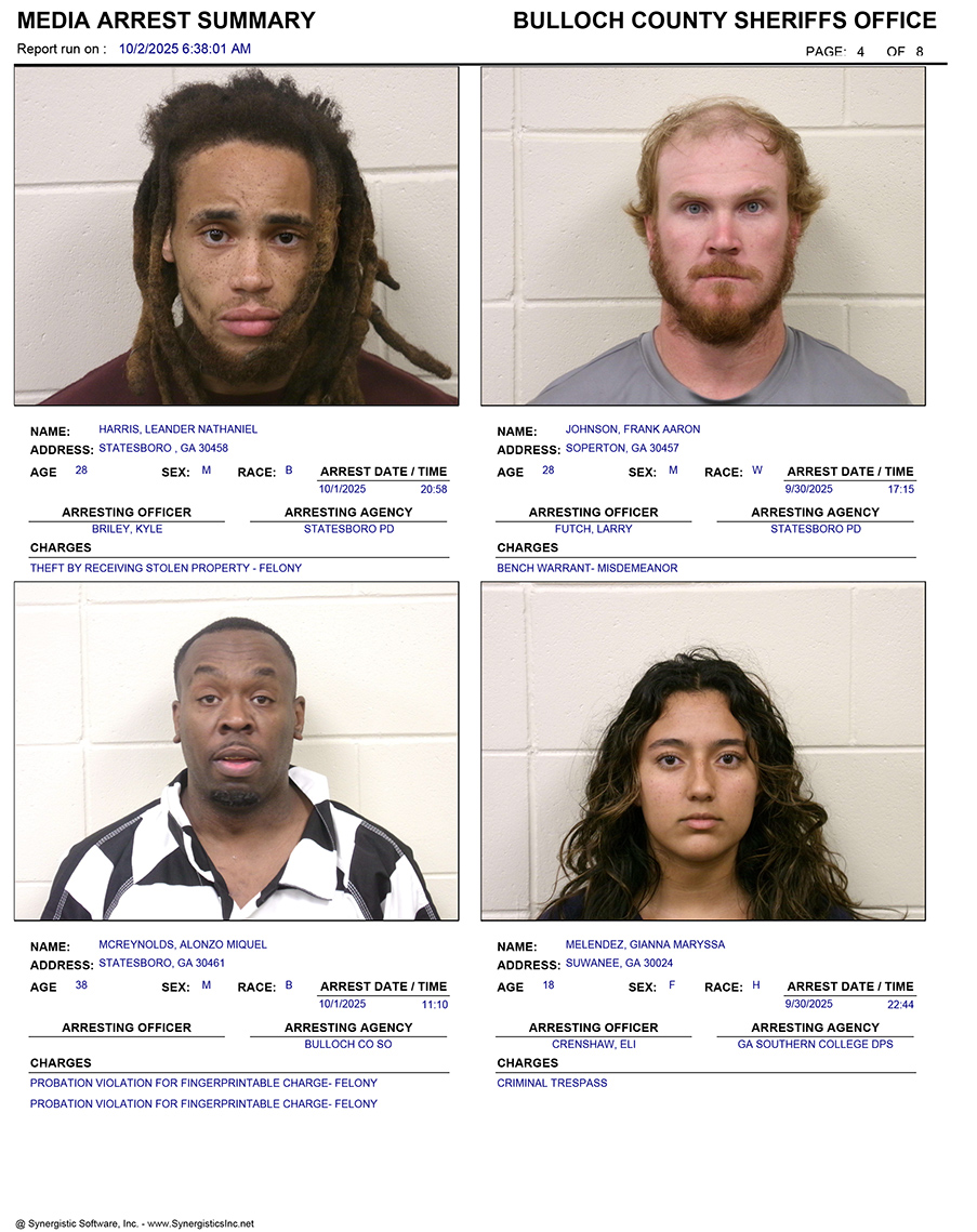 These records are matters of public information provided by the Bulloch County Sheriff’s Office. Booking reports are details of arrests only. All persons below are considered to be innocent unless proven otherwise in a court of law.