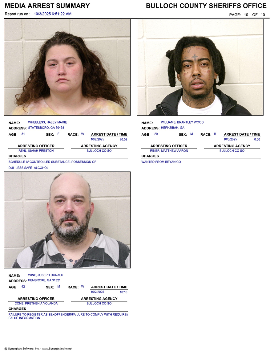 These records are matters of public information provided by the Bulloch County Sheriff’s Office. Booking reports are details of arrests only. All persons below are considered to be innocent unless proven otherwise in a court of law.
