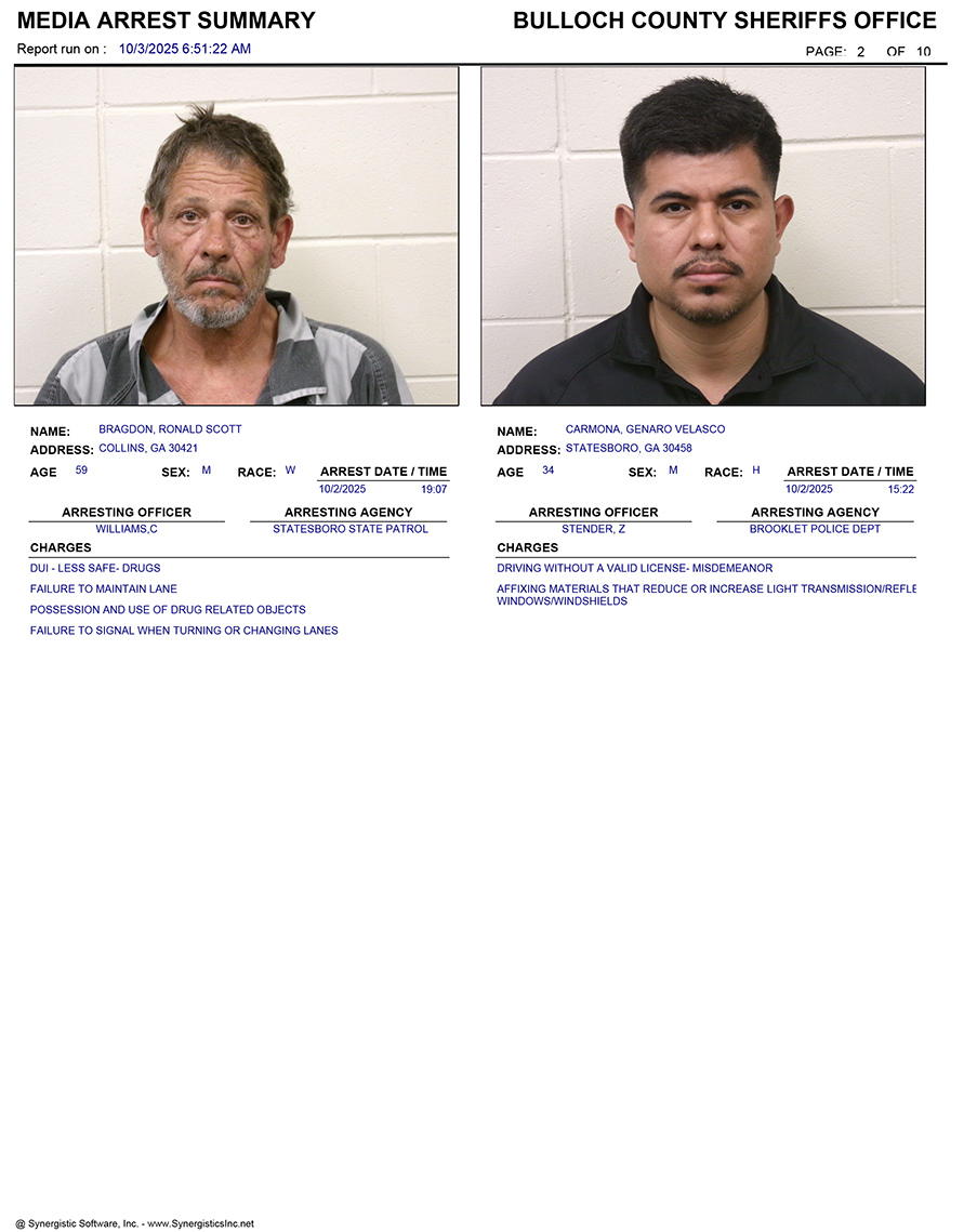 These records are matters of public information provided by the Bulloch County Sheriff’s Office. Booking reports are details of arrests only. All persons below are considered to be innocent unless proven otherwise in a court of law.