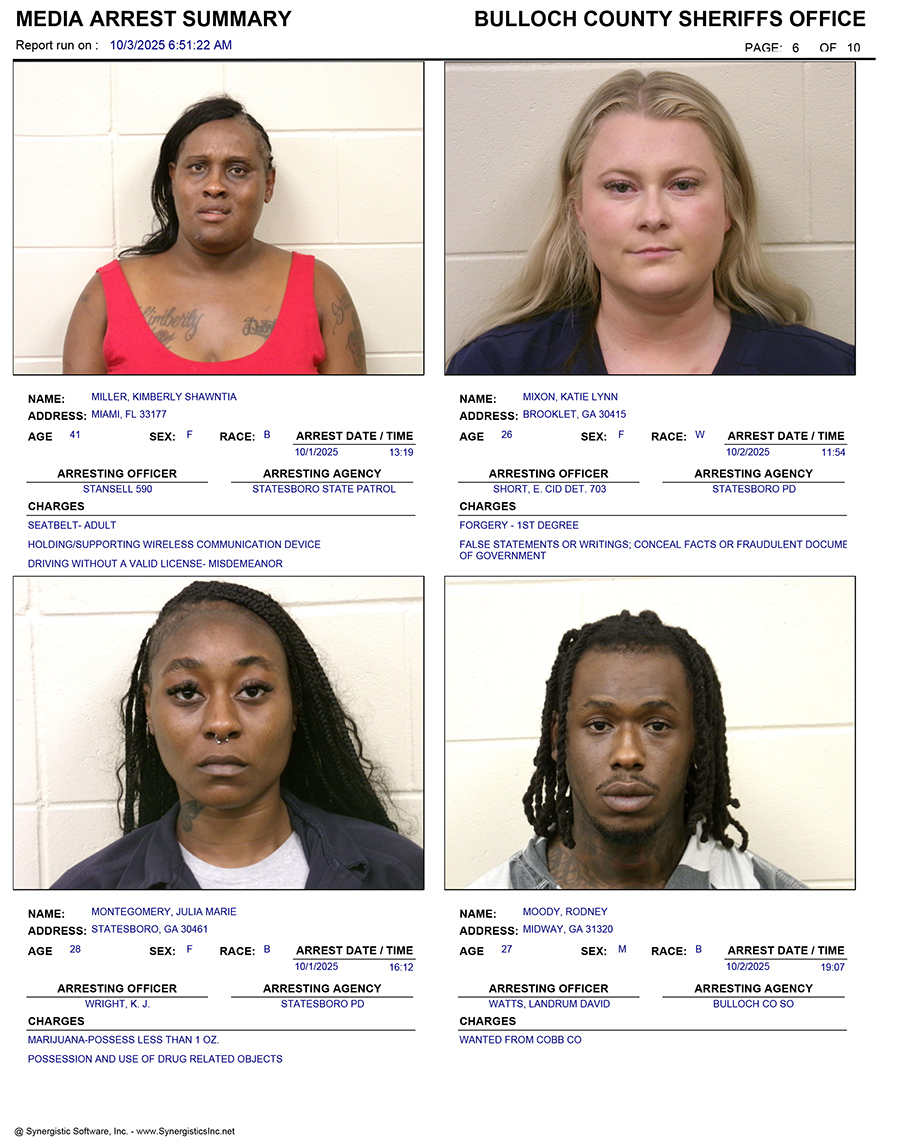 These records are matters of public information provided by the Bulloch County Sheriff’s Office. Booking reports are details of arrests only. All persons below are considered to be innocent unless proven otherwise in a court of law.