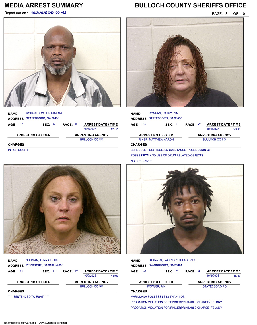 These records are matters of public information provided by the Bulloch County Sheriff’s Office. Booking reports are details of arrests only. All persons below are considered to be innocent unless proven otherwise in a court of law.