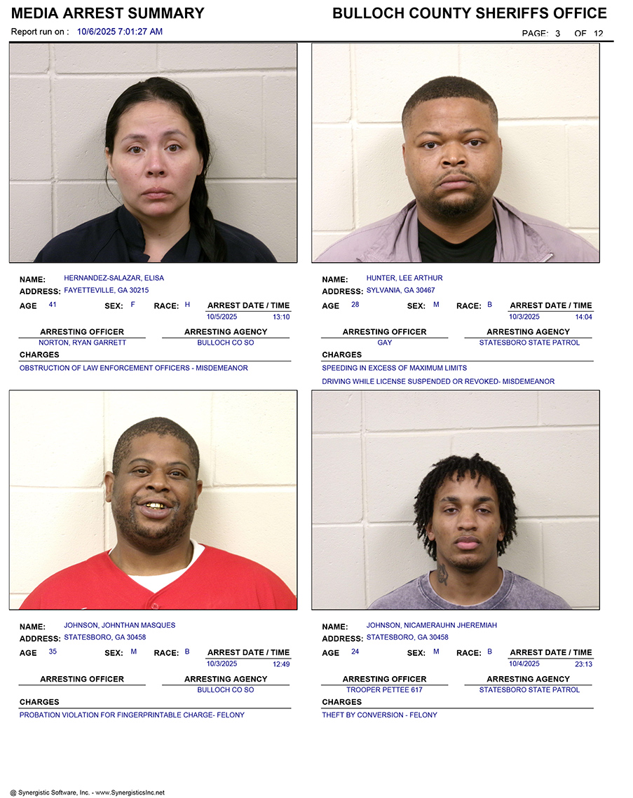These records are matters of public information provided by the Bulloch County Sheriff’s Office. Booking reports are details of arrests only. All persons below are considered to be innocent unless proven otherwise in a court of law.