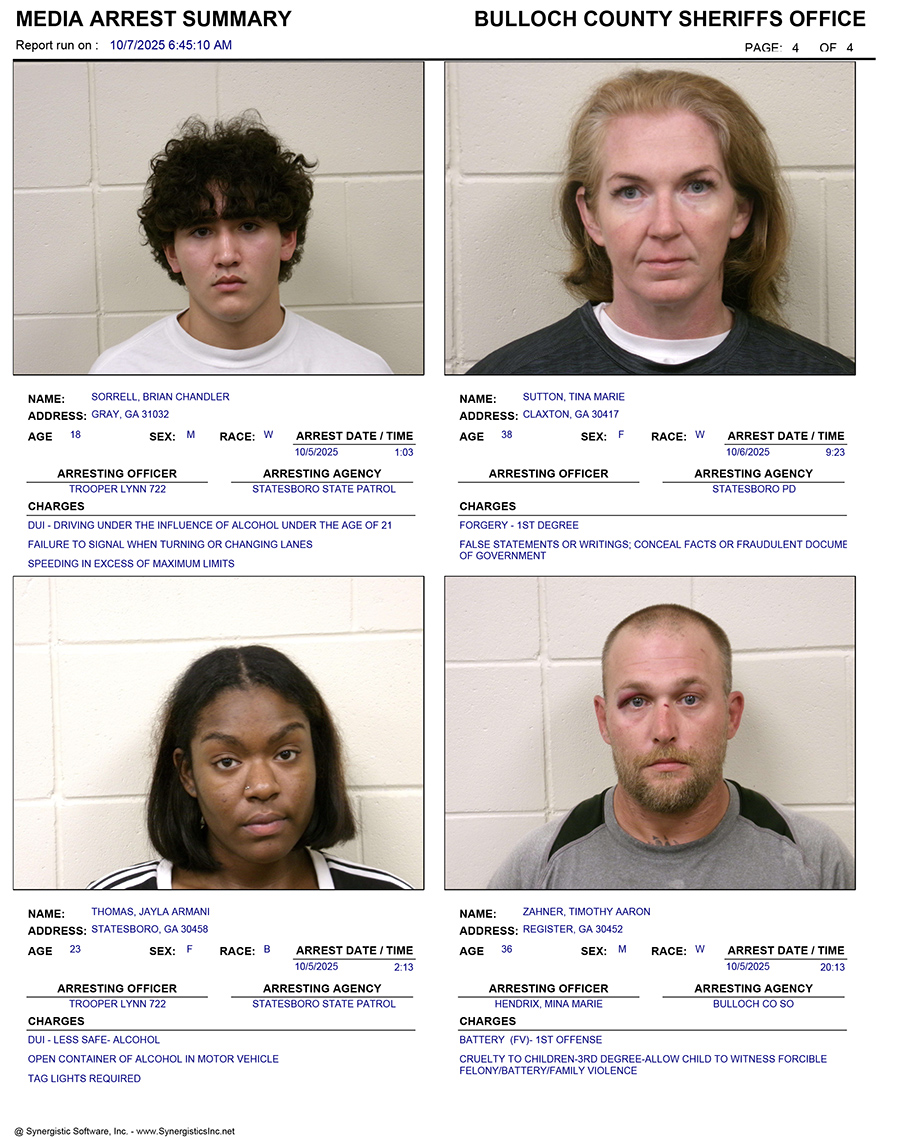 These records are matters of public information provided by the Bulloch County Sheriff’s Office. Booking reports are details of arrests only. All persons below are considered to be innocent unless proven otherwise in a court of law.