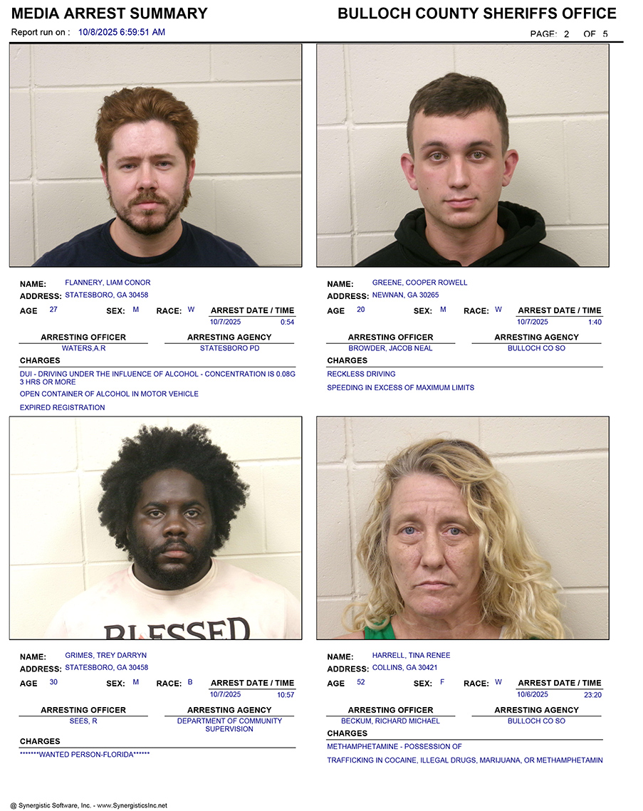 These records are matters of public information provided by the Bulloch County Sheriff’s Office. Booking reports are details of arrests only. All persons below are considered to be innocent unless proven otherwise in a court of law.
